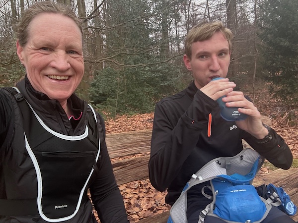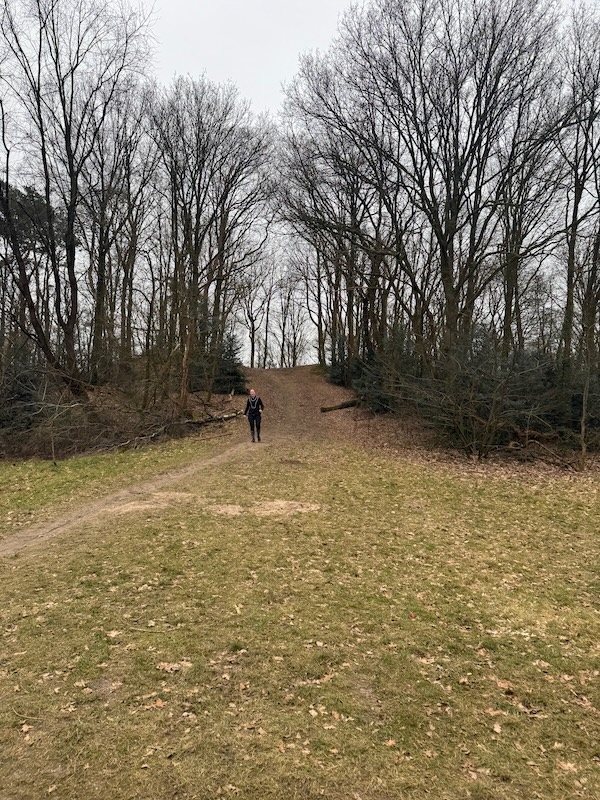 Na 7km gingen we even zitten om te drinken en stroopwafeltjes te eten en water te drinken. En weer door. Het ging niet heel veel soepeler, maar doordrammen kan ik prima! Tussen de hulst door lopen was het mooiste eigenlijk. Ik had het best redelijk naar mijn zin en niet koud of zo. 9km in een uur. De Sijsjesberg op en Vincent ontving een telefoontje van zijn werk.