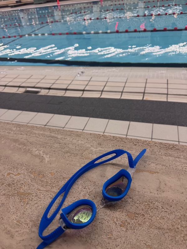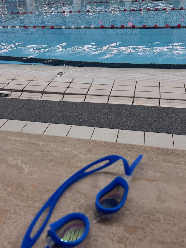 Om 9 uur s’ avonds zwemmen: een tva duurtraining – HELFT ZONDER ACHTJE GEZWOMMEN! Lekkend brilletje. Vreselijk kut. Maar dan kan je alleen maar zwemmen met 1 oog dicht. De tijd van 2:12 op de 100m is natuurlijk erg traag, maar Garmin heeft veel pauzes meegeteld. Ik zwom in baan 2. Eerst 100m met achtje. Dan 100m zonder achtje. 100m is net te doen. Garmin telt 175 m. 🙄 en dan 4×100 en tussendoor 50m armen, school, rug. Ik moest voorop. Met achtje. En vollopend brilletje links. Netjes gedaan. Dan weer 4x100m met bijleggen, oksel, slepen. Ik moet weer voorop. Bril nog steeds stuk. Dan ben ik er klaar mee. Ik heb gemerkt dat ik heel erg omlaag miet kijken. Buiten doe ik dat. In het zwembad niet bIk leg mijn achtje aan de kant en ga achteraan. 550m. Ik voel wat er gebeurt: ik ben doodsbang om te verzuipen. En dan blokkeert de ademhaling en het omlaag kijken. Dat brilletje helpt ook niet. Maar ik wil en zal 550m zwemmen. Superzwaar. Na een stuk of 400m leg ik me er bij neer dat het trager gaat en dat ik niet ga verdrinken en dan komt er wat rust en wat lef om lager te liggen. Lastig met een vol brilletje, maar he: training is training en iets nieuws willen leren en proberen. Ik ben supertrots op mezelf.