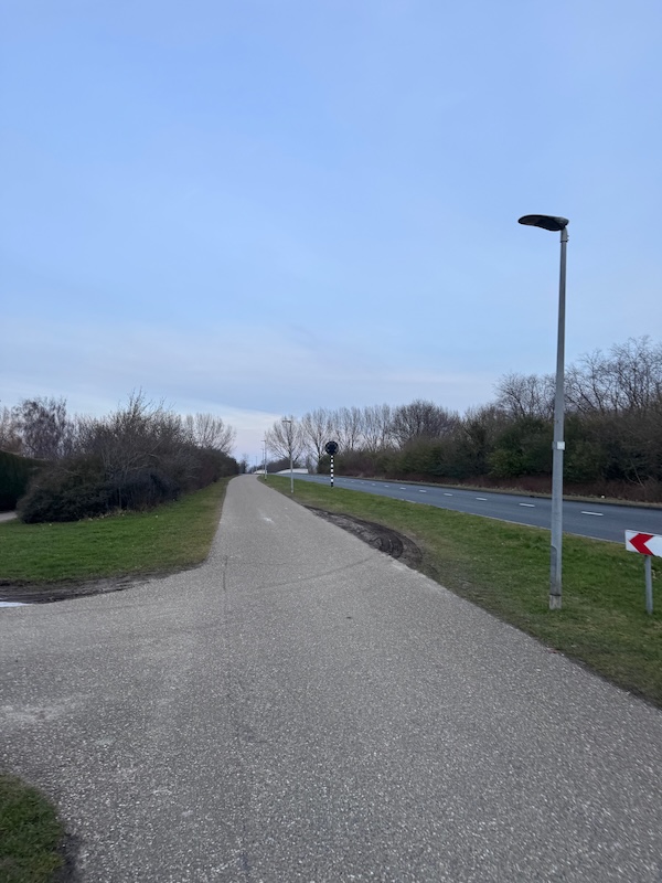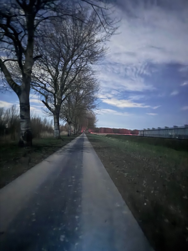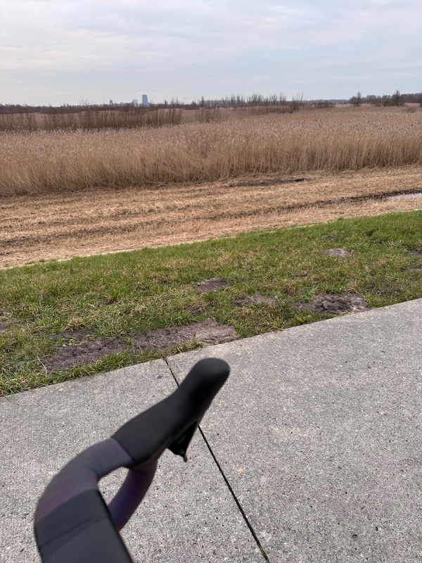 Dan verder langs de noorderplassen. Vincent maakt een plasstop. Ik fotografeer de kille dorre plassen. We kunnen lekker tempo maken en het is niet koud. De wijk door. Dat is flink anders qua gevoel: wind tegen en koud. We gaan de stad door. Nadeel: het wordt snel donker. Voordeel: iets minder heftig de wind tegen. Nadeel: het koelt snel af. Vincent heeft het heel erg koud en zwaar. Ik vind het nog steeds wel leuk en deel op in hele kleine blokjes: naar de atletiekbaan, de brug over, naar het volgende brugje, de stoplichten; heel klein maken en overwinninkjes halen. Vincent krijgt het echt heel koud en zwaar. Ik niet echt. Beetje koude voeten. En onwijze trek. Het wordt me wel te snel donker en we hebben geen lampjes natuurlijk. Langs de plus en dan naar onze straat. Vincent gaat lopen om warm te worden, het laatste straatje. Ik haal de sleutel en bedenk te laat dat ik de poort open kan doen met mijn telefoon. We fietsen 24km met een gemiddelde van 22km per uur. Geen hoogvlieger, maar wel een goeie training. Een beetje afzien en doorzetten is nooit weg. Door deze vermogensmeter gaat mijn fietsVO2max wel omhoog! Ik heb genoeg trek om direct patat te gaan halen! Nergens last van eigenlijk. Was leuk zo. Samen bikkelen. Wel last van lichte koppijn door droge lucht.