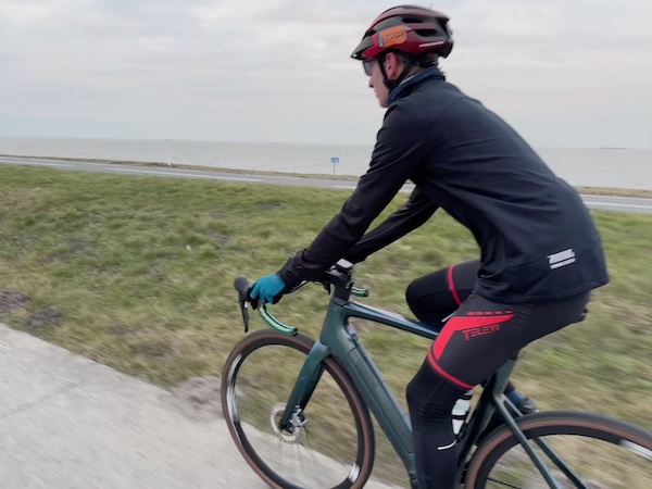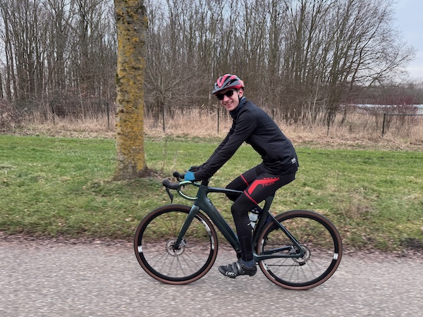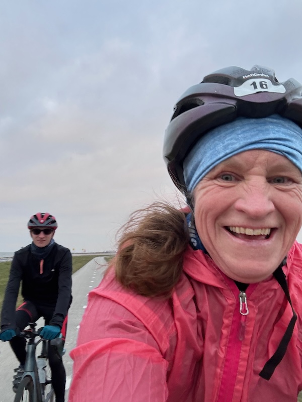 En dan om kwart over 5 snel naar buiten om te gaan fietsen. heerlijk! Ik vond het stiekem ontzettend leuk en stoer om met deze kou tegen de ijzige wind in te bikkelen. Het was Vincents idee! Meteen om 5 uur gaan lukt toch net niet, er moeten eerst veel laagjes aan! Vincent pakt het motortje en de piepende remmen en ik de gravelbike. We zien niemand anders die fietst – gek he. 🤪