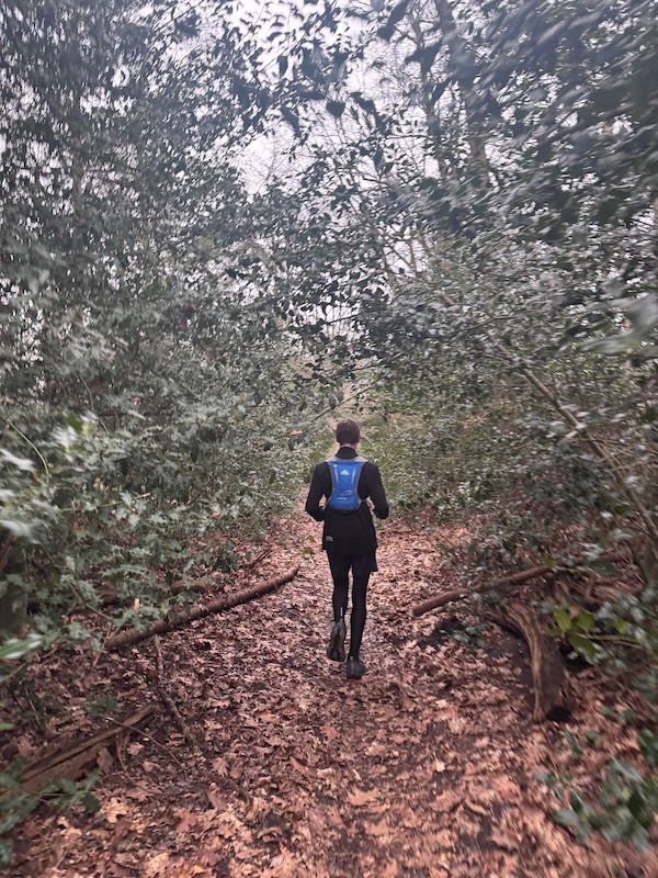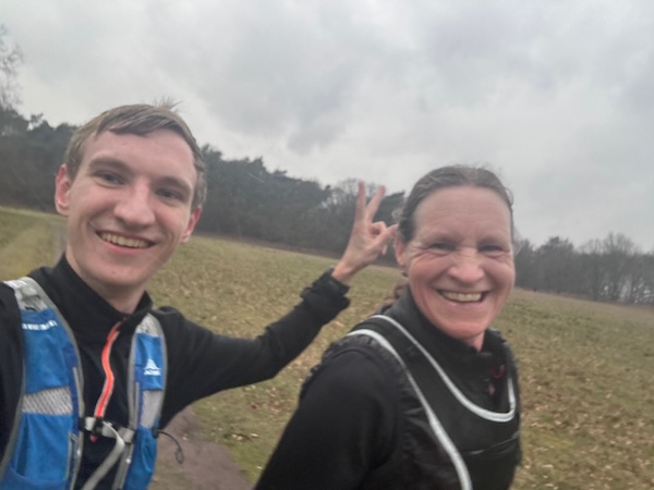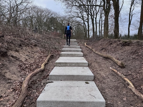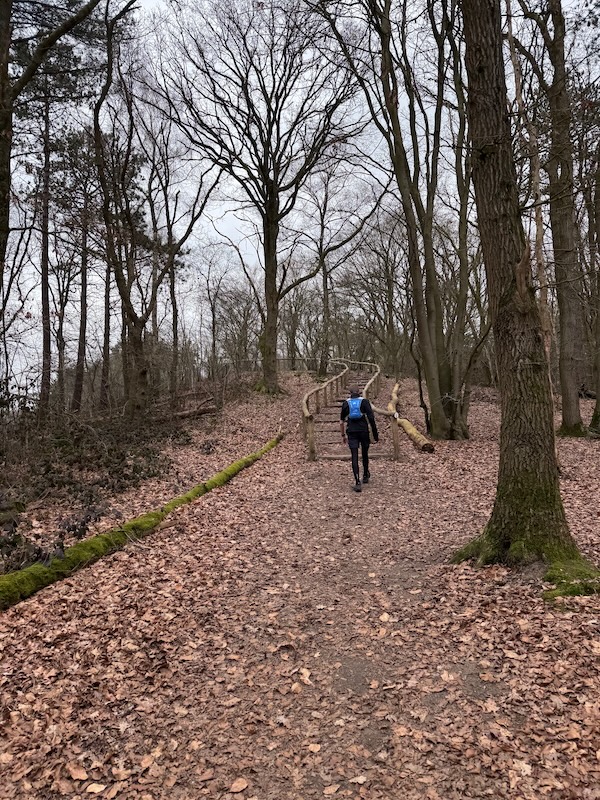 Het begon te druppelen. Vincent deed de route en ik ging strak achter hem aan. Gek genoeg ging het wat makkelijker bij mij daarna, geen idee waarom. Het bleef regenen, dat was irritant, maar niet heel erg ofzo. Ik ging wel aftellen. Zeker na 11km.