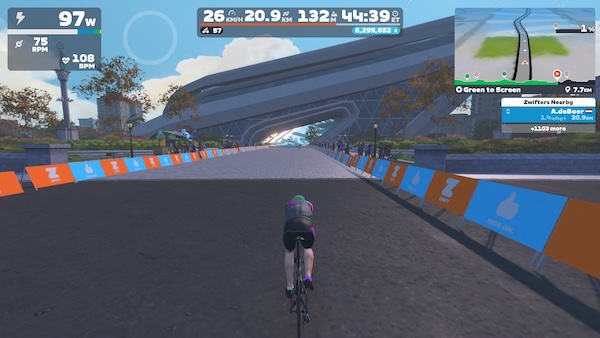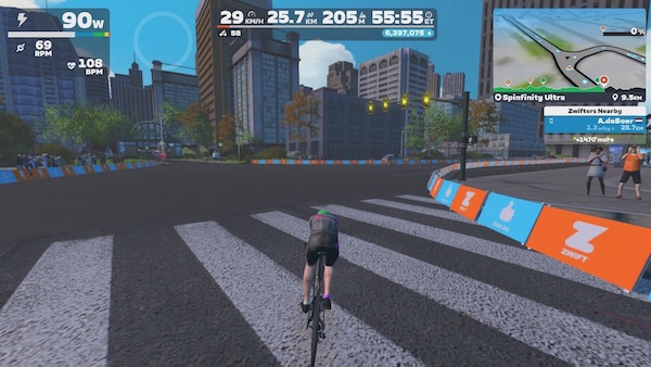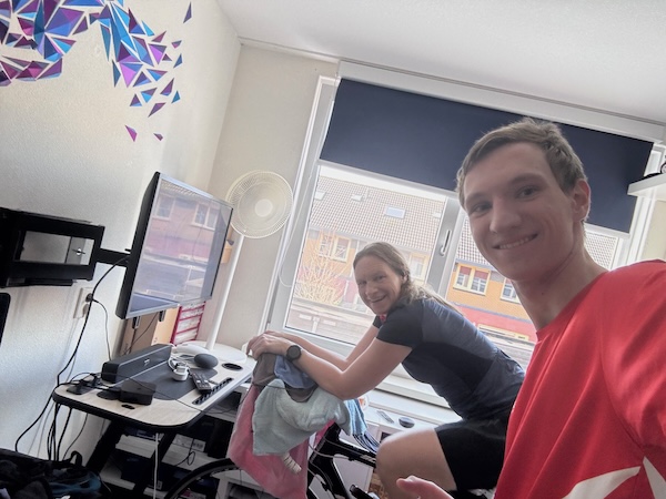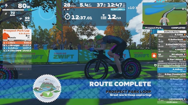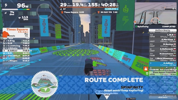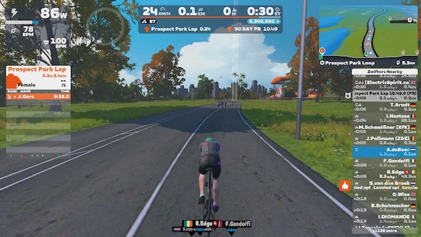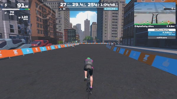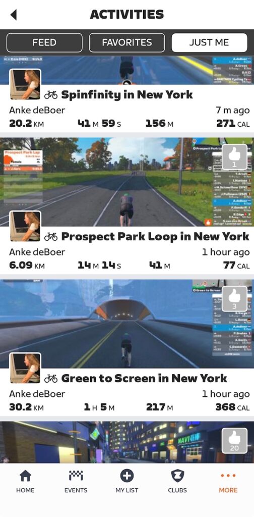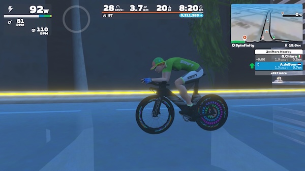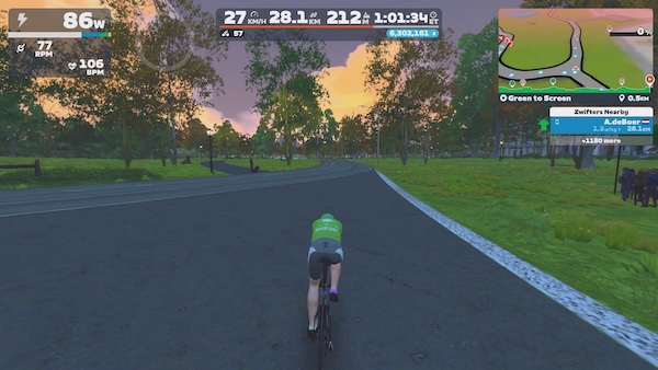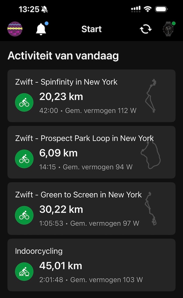 Vincent stapt net in de douche als ik de volgende routes uitzoek. Ik ben nog een beetje in New York, dus ik pak deze gewoon lekker mee, nu ik nog eventjes heb. Een kwartiertje fietsen, elke minuut is meegenomen! Niet dat ik nu mijn best doe, ook niet. Ik heb nog steeds een beetje hetzelfde shirtje als daarstraks geloof ik. Ik maak het rondje om het park af, haal daar puntjes voor in Zwift en maak 6km vol. Door voor de worstebroodjes!