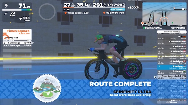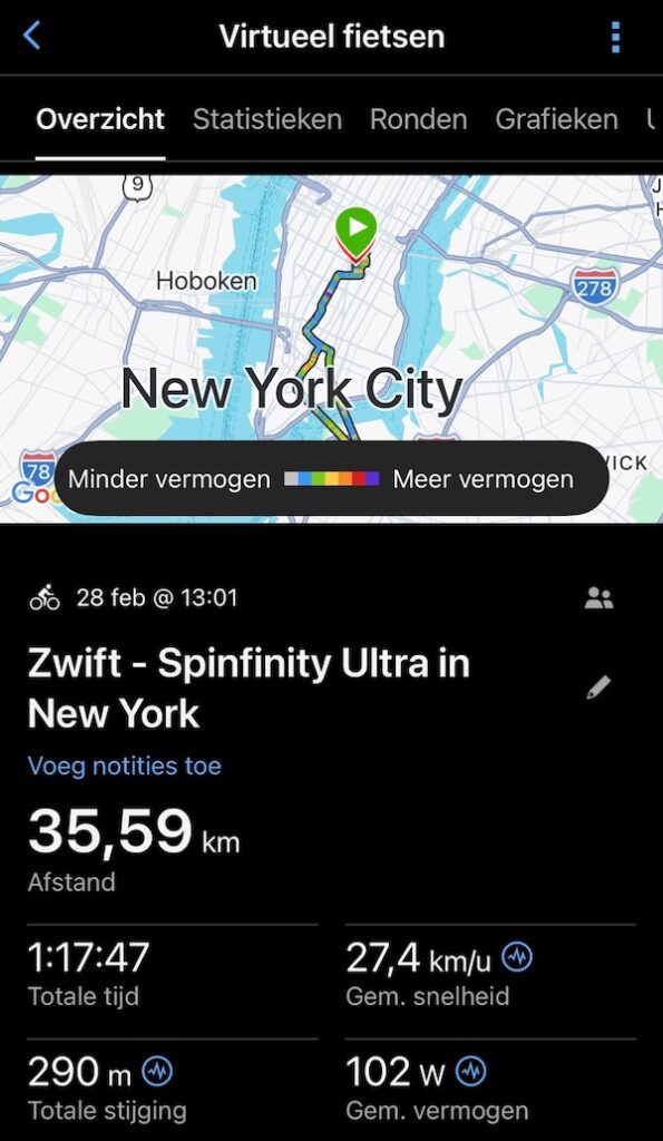 Data in Garmin: 35,59km met een gemiddelde van 27,5km en 290HM. 2 keer over de bruggen in New York. Ik ben niet fit. Niet dat ik ziek ben, maar ik voel me niet 100% en zelfs geen 80%. Overal pijntjes, maar geen koorts. Veel rode vlaggetjes, maar ik kijk er nog wel overheen. Na een lastige ochtend stap ik op de fiets. Ik twijfel: een korte route, zodat ik kan afstappen of een langere route en proberen om de training van 1uur25 vol te maken. Ik gok het laatste: afstappen als het niet lukt, kan altijd. Weer New York, ik ga het herkennen intussen. Het begin is heel moeizaam, er zit geen kracht of tempo in. So be it. Ik wil Level 58 worden, dat op z’n minst en dat lukt me na een kwartiertje al.