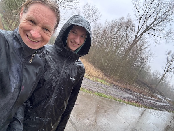Vincent die vertelt van zijn auto-wasactie. Modder. En regen. Het ene moment wat meer dan het andere, maar de hele tijd regen. En wind. Alles wordt nat. Een lange wandeling wordt het niet, maar de buitenlucht is toch lekker. En de stappen halen ook.