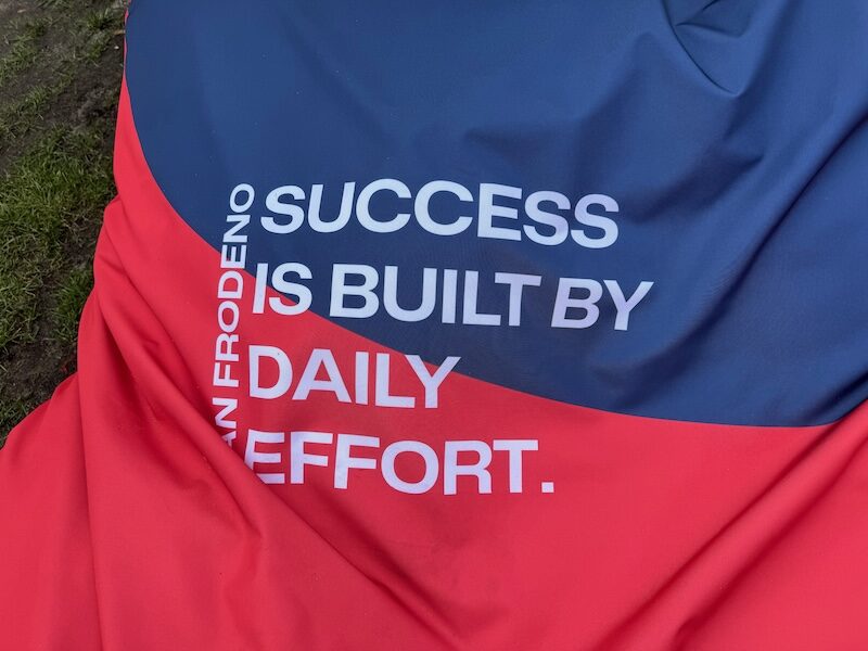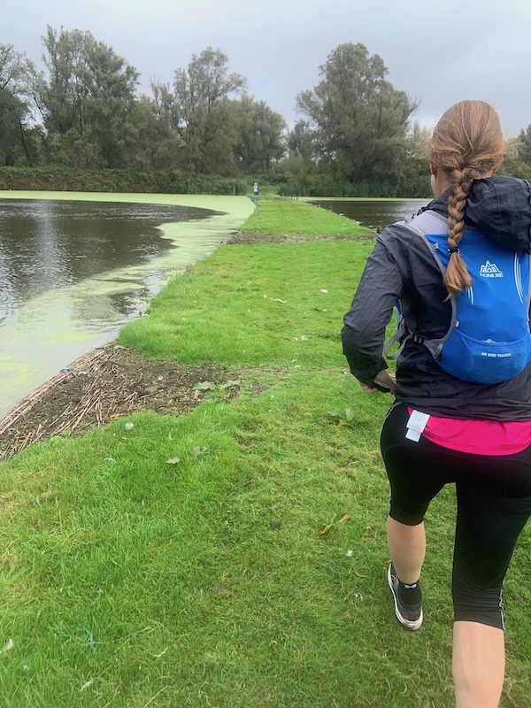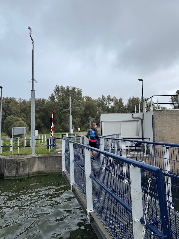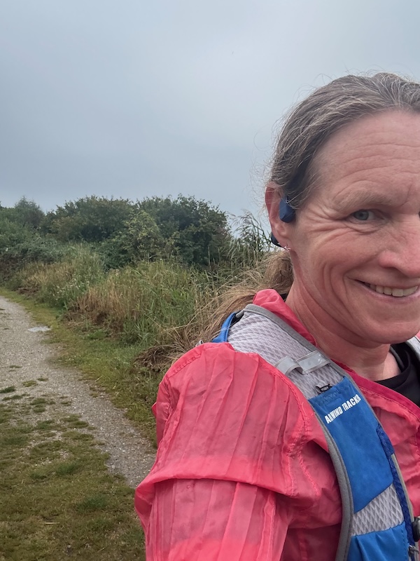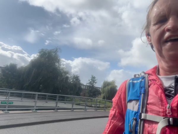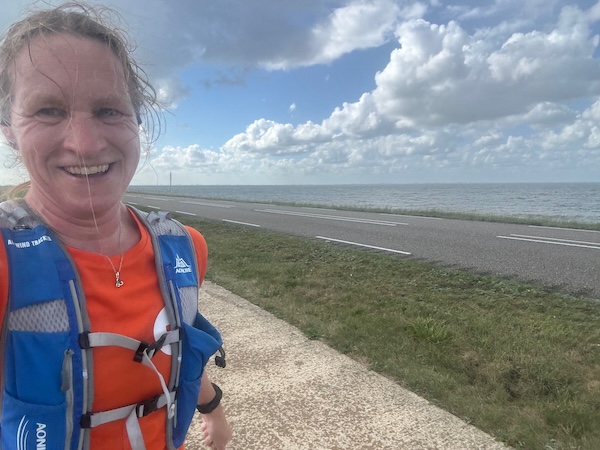 Bij de pompoenen stopt een vrouw en ik ren door. Maar dan móét ik. Onhandig. Ik stop tot de mevrouw voorbij gefietst is en ze roept ‘well done’. Schattig toch? Het is veel, diarree en t is wat het is. Ik maak de 1800 af op een mooi tempo van 5:30. Echt, zo snel ben ik niet hoor! Op de dijk wind mee in de rust en dikke regen.