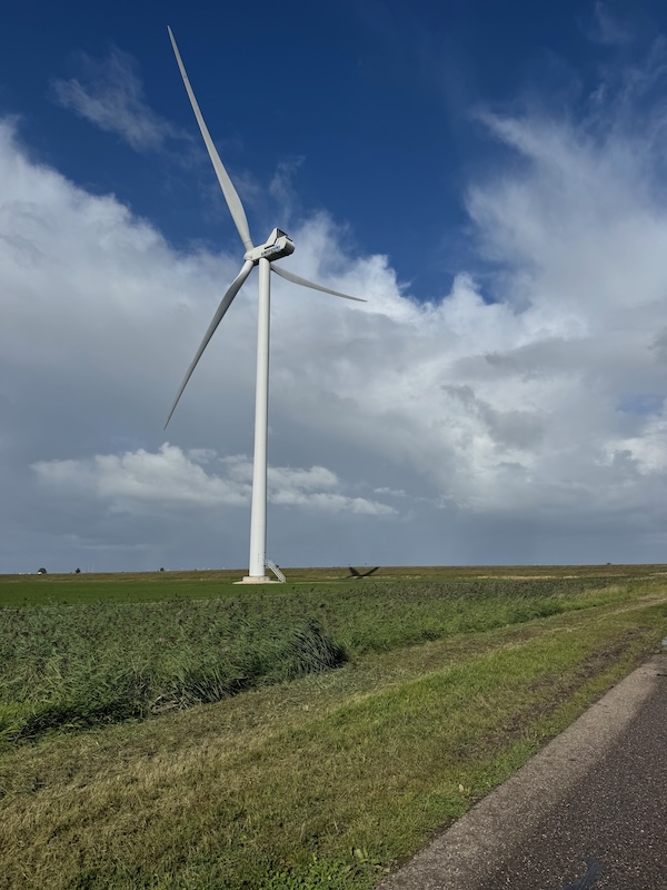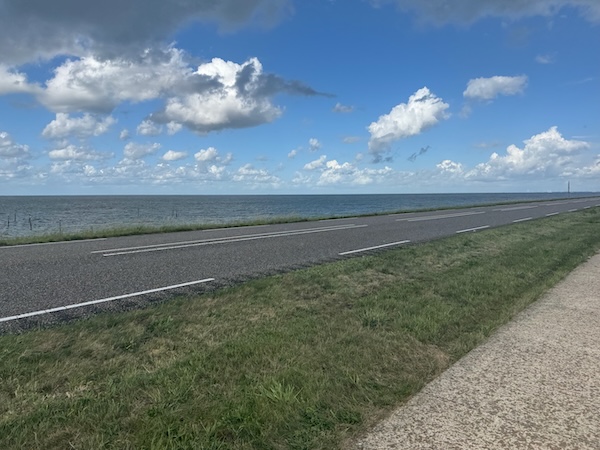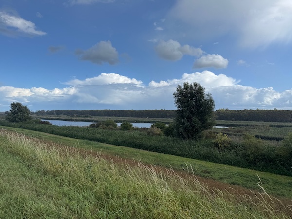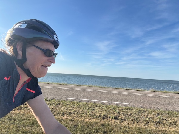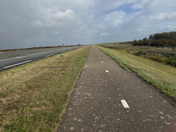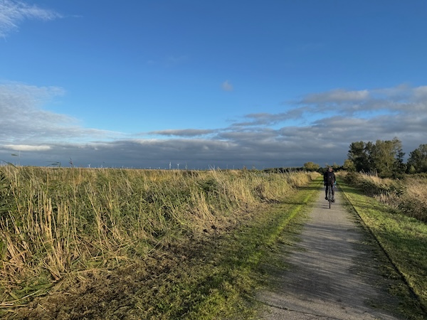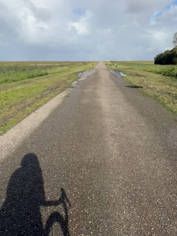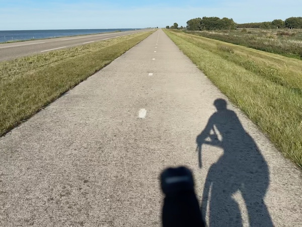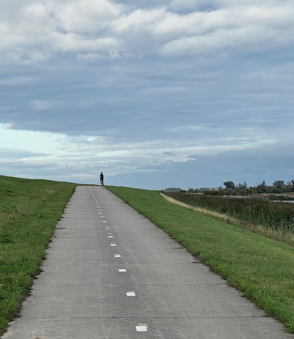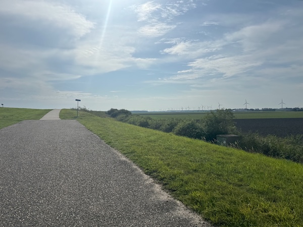 en dan wind mee, da’s leuk! Geen heuvel te bekennen en vooral GEEN DRUPPEL REGEN. Alleen maar zon! Op de dijk was er inderdaad wind. Ik werd 1 keer een beetje opzij geblazen, maar ik dacht: dit is het klagen toch niet waard?