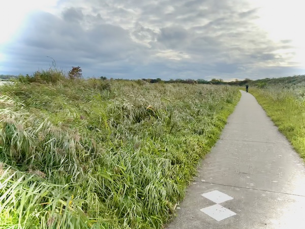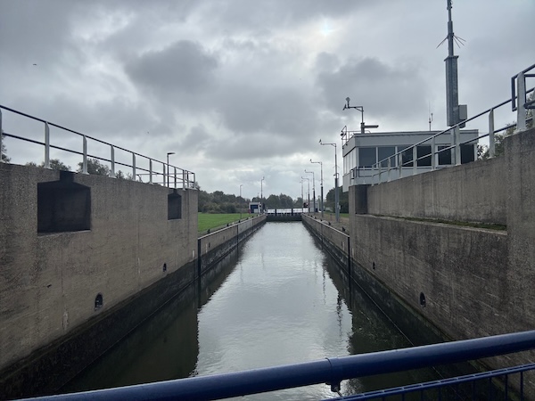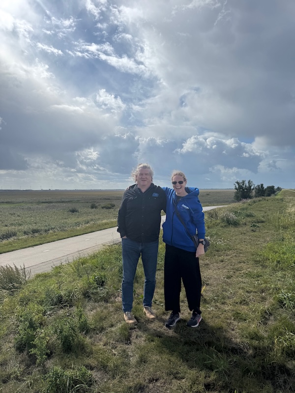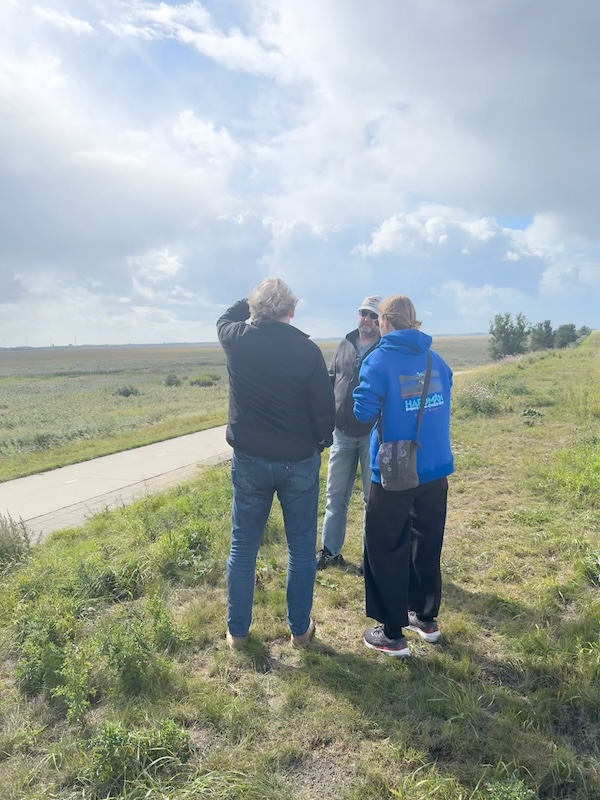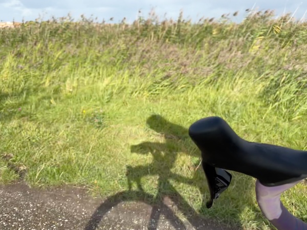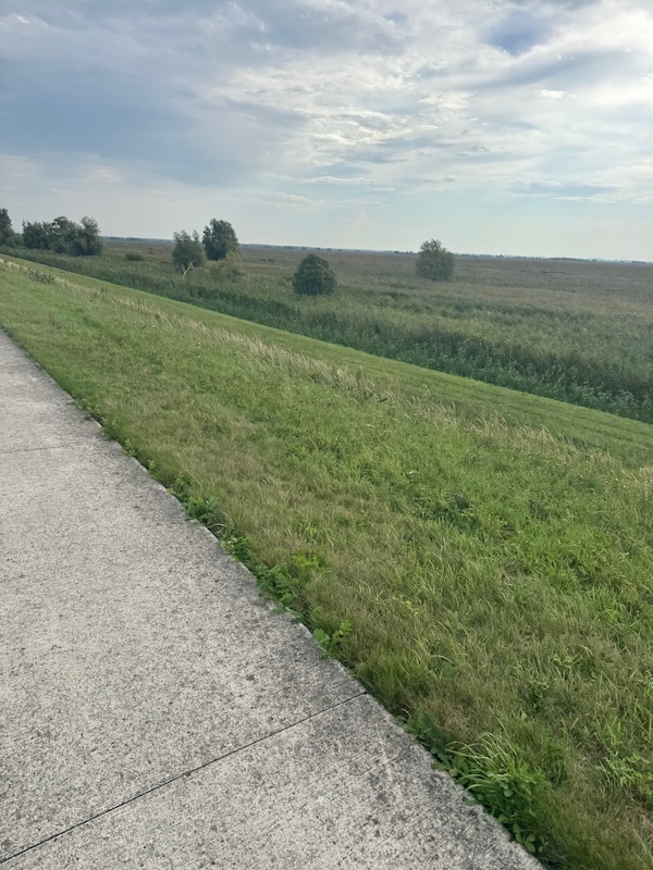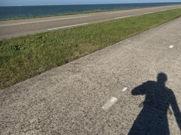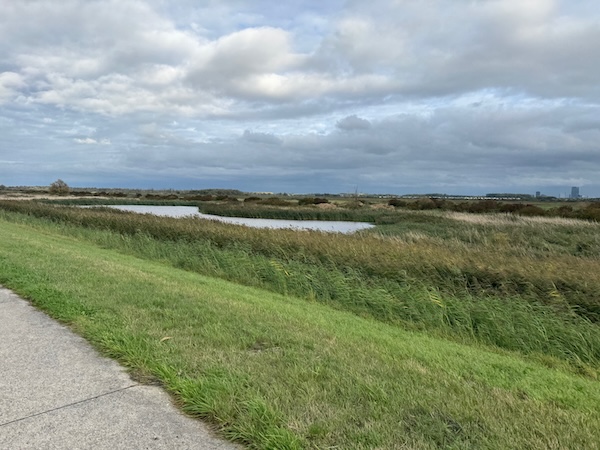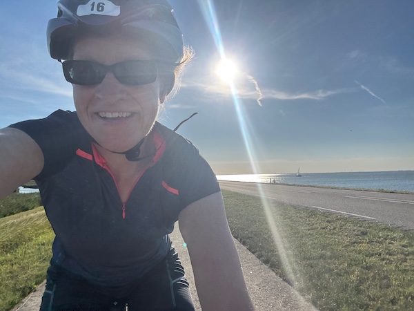 en dan wind mee, da’s leuk! Geen heuvel te bekennen en vooral GEEN DRUPPEL REGEN. Alleen maar zon! Op de dijk was er inderdaad wind. Ik werd 1 keer een beetje opzij geblazen, maar ik dacht: dit is het klagen toch niet waard?