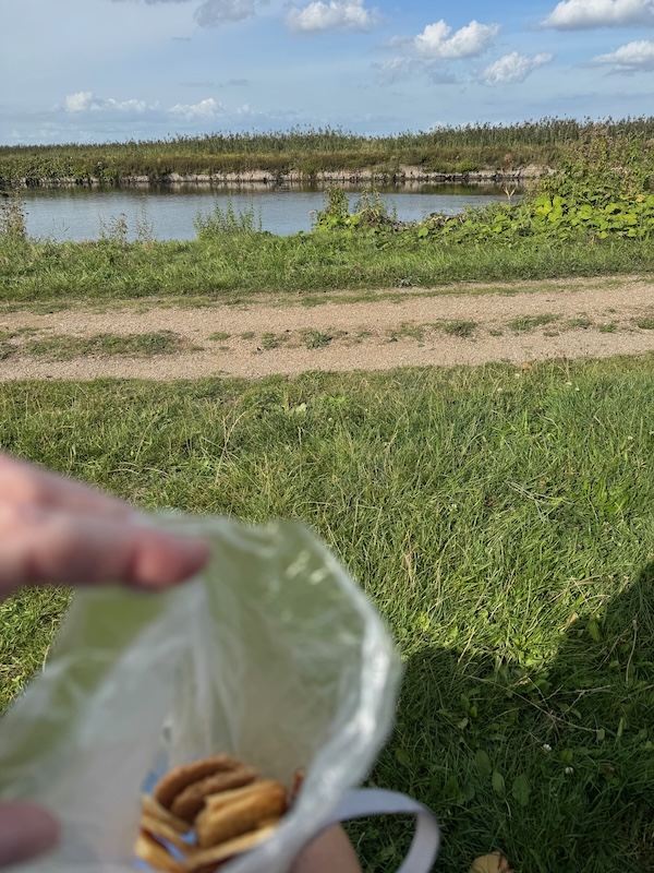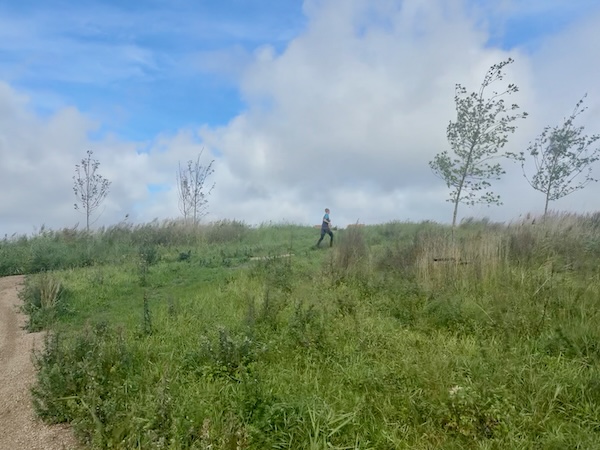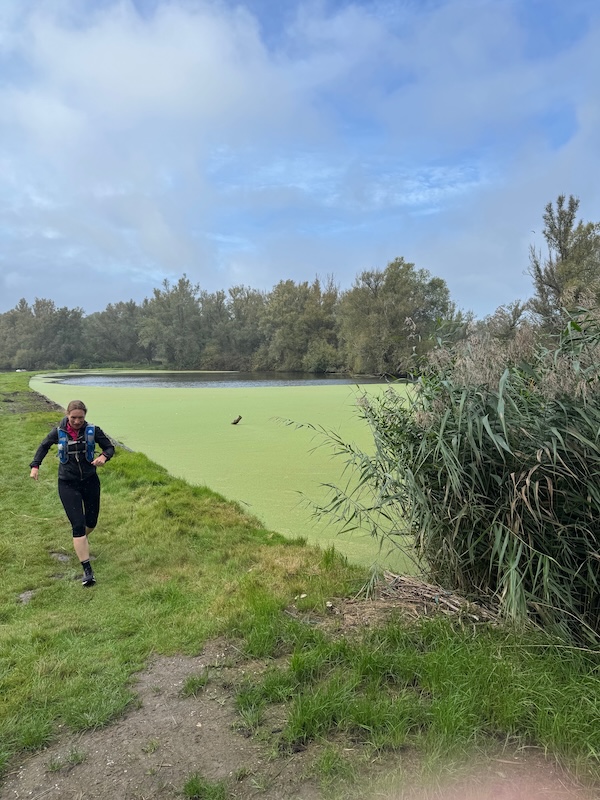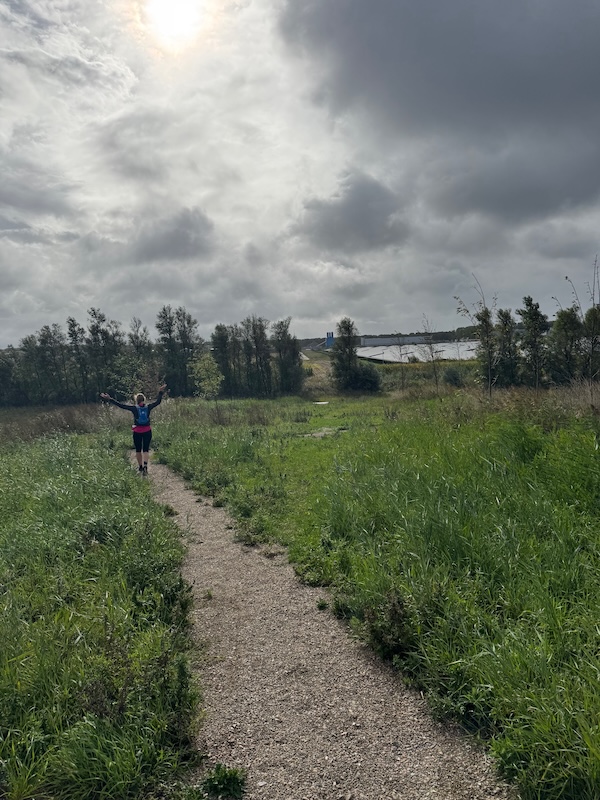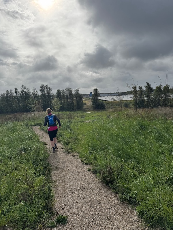 Het was warm. Niet te heet hoor, maar gewoon lekker nog een zomers dagje. Ik had me niet ingesmeerd. Rugzakje op, muziek aan. Inhouden. 15minuten op 6:00-6:20 is heerlijk easy. Ook belangrijk om zo te lopen! Maar het voelde heerlijk gemakkelijk! Ik had een route van 13km, maar de wind mee was niet echt uit de goede hoek. Ik moest de route steeds aanpassen. Liep ik toch niet zo hard als ik dacht, en als ik al ietsje aanzette, meteen te hard. Dus ik hield het superkalm. Foto in de rustpauze.