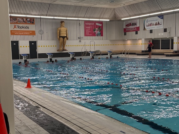 En ‘s avonds zwemmen in het zwembad. Voorop in baan 2.