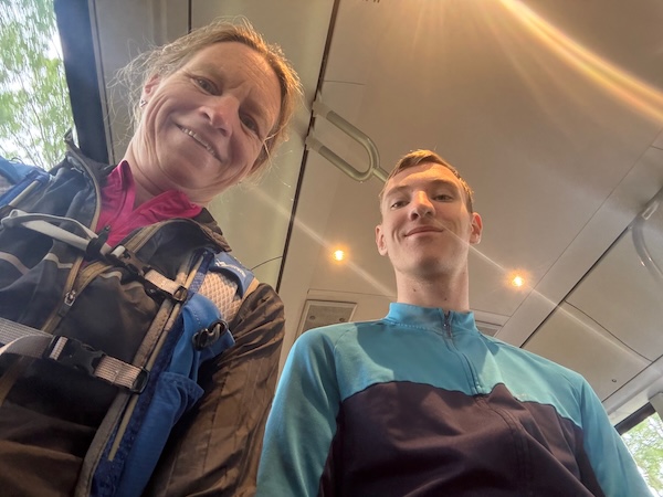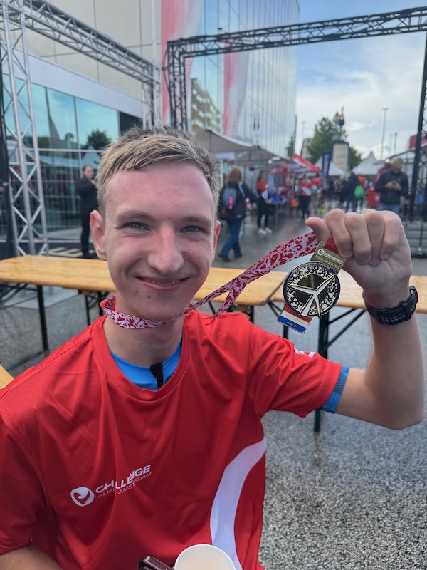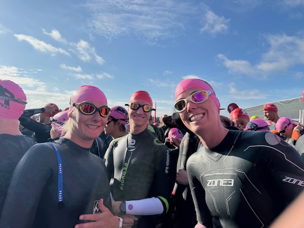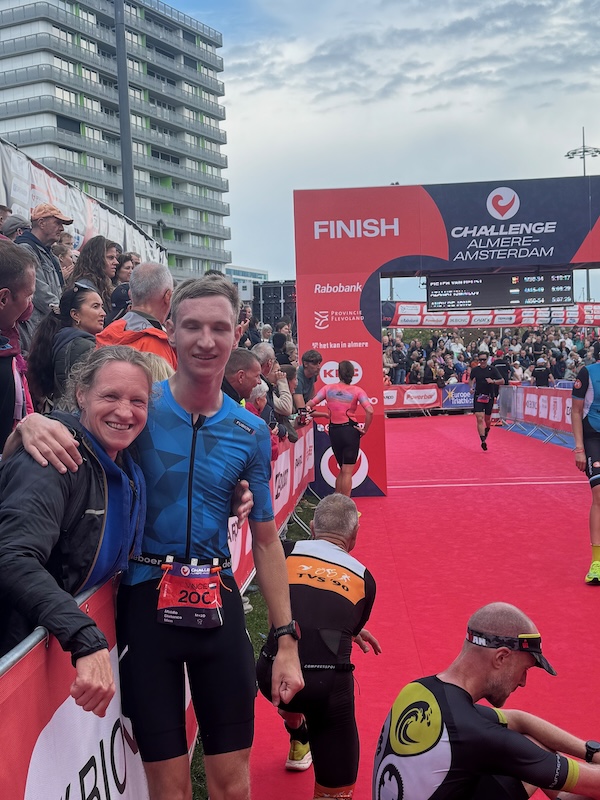 Ik vond het ook spannend. Onrustig geslapen. Goed eten, dat wel. Dat spannende moment qua fiets of die goed is. Maar het gaat allemaal goed. En dan naar de zwem start wandelen. Het is gek niks te hoeven doen en toch overprikkeld te raken. Maar helemaal tot de zwemstart begeleidt. Blij met MvdB en AR om hem heen.