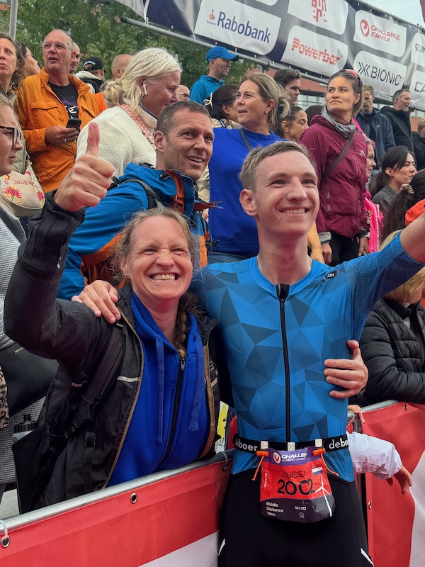 Kwam Vincent aan. Knuffel. “Ik kan het niet, ik stop met triatlon, ik ben leeg.” Tranen. En dan zegt hij ‘sorry’, maar het maakt niet uit, vertel ik hem. Hij is leeg. Ik ken het al te goed. Een paar slokken cola van mij. Het regent. Hard. Hij is koud en moet door. Zo moeilijk om aan de zijlijn te staan dan! Ik zou hem wel willen helpen. En dan door de stortregen en het onweer terug lopen. Niet meer over het bruggetje. Het drukke centrum in. Ik sta op een mooie plek achter de finish. Maar de eersten van de hele komen binnen. Ik zie RB uitleg geven aan Alan en Ivo. Alan ziet mij. Ik mis de finish van Vincent! Net op dat moment teveel piepjes. Hij is heel leeg en moe. Ik ondersteun en knuffel hem. Geen sub 5, maar wat een doorzetter! En dan roept iemand van boven achter de fotografen: Ankiiiee, Vincentt!! Alan fotografeert ons.