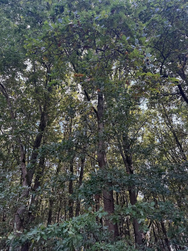 Ik had er zin in om gewoon 14km mijn neus achterna te zwerven. Goed bijgeslapen, de blogs af en bijgewerkt en 2 uur na de lunch. Maar het viel tegen. Het ging niet zo vanzelf als de afgelopen weken. De supercompensatie is op denk ik 😌 niet dat het niet ging of dat er reden was om echt te stoppen, maar in deze periode heb ik altijd extra pijntjes: links is stijfjes, de knie trekt, onbedwingbare vreterigheid, wat prikkelbaar. Ik erger me nu extra aan alle geweldigheid van de CAA en het geklaag over het weer. Verder geen excuus, prima weer om te lopen en afwisselend met bos. Maar te herkenbaar. En ik moet al binnen 3km de bosjes in met diarree. Vervelend. Ook niet het moment om te eten en ik maak een foto van de bomen.