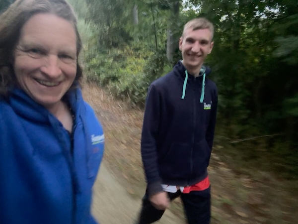 Ik loop door het bos verder en Vincent appt of mij me tegemoet zal lopen. Ik ben net iets teveel aan het appen om op het tempo te letten, dus het zal te hoog zijn. Nog in het bos moet ik 5x 20 seconden heel hard. Ik haal het niet geloof ik. De minuut rust red ik wel. Ik blijf met Vincent appen en ik ga sneller dan ik dacht en ben al op de hoek. Ik dacht ook dat ik nog een keer intervallen had, maar dat is niet zo. Ik ga naar het centrum en dan moet V me inhalen. Bij het vossenhol lopen we samen. Lekker rustig voor hem! Rond de 6:00 weer.