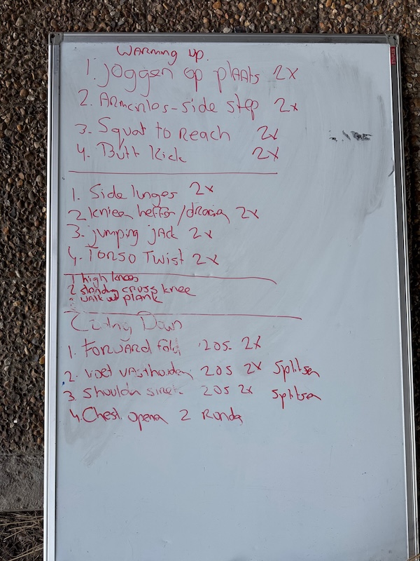 Ik heb opgeschept over mijn triatlon! Verder goed meegedaan. Warming up rustig aangepakt. Daarna 5 rondjes met rennen, oefeningen. Dat zijn er ook 5 ook! Kan me niet schelen dat de rest er 4 doet, ik stop pas na 5! Dan nog de mat-oefeningen. Ik hou het op conditie prima vol. Het is ook best aardig om te doen deze keer. Prima weer, prachtige kleuren. De cooling down vond ik nog het minst!