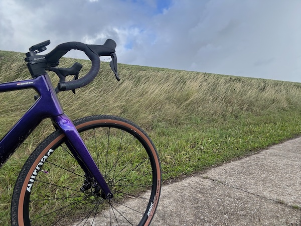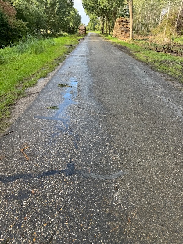 In de stad wind tegen. Beetje her en der gefietst met het vage idee Noorderplassen. Tempo uiteraard laag en laagst. Maar muziekje aan en een beetje doortrappen. Ik heb de slechte weg op de foto gezet. Ommetje gemaakt bij View en toen wilde ik niet de extreme wind tegen langs de plas, dus… ik reed langs het water! Met héél veel tegenwind. Dan rechtdoor, want dat lijkt weer te kunnen. Met de gravelbike wel ja. Ik had de witte burg gezien en dacht: daar ga ik heen, maar ik zwierf de andere kant op. Ik dacht: he, de wind is weg! En toen begon de regen natuurlijk. Dikke druppels. Ik zwierf weer een andere weg op en ik dacht: ik ga niet tegen de wind in op het npw-parcours. Dus ik reed op die weg tegen windkracht 6 in.