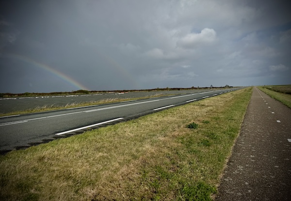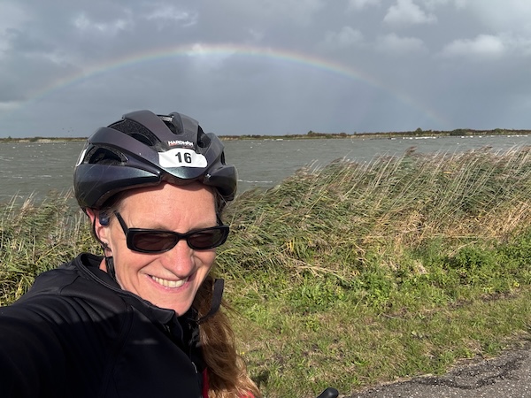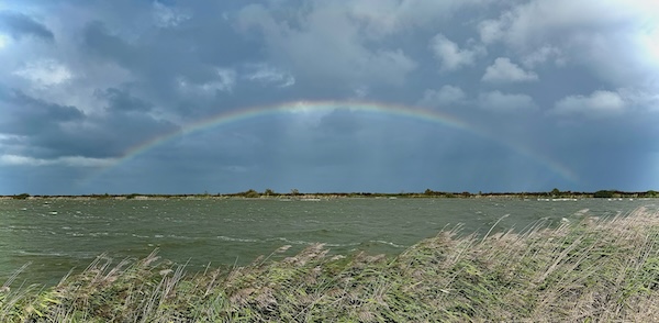 En dan weer zon als ik de dijk op ga. Ik maak onderweg wat foto’s en heb het best naar mijn zin op deze fiets en op deze manier. Beter dan binnen. Sowieso. Een prachtige regenboog!🌈 ik stop voor een foto.