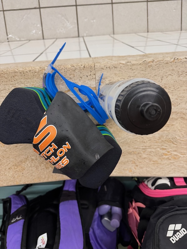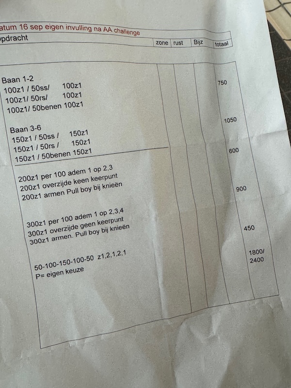 2x200m zone 1. Zie mijn tempo en dit. Dan is zone 1 opeens 1:58. DS voor me uit. Dan 100m school/rug. Vind ik niet leuk. Op de rug is de baan veel langer. Daarna 6x 100 zone 2. Om de beurt vooraan. Er is nogal een verschil, maar ik vind het prima. Het hoofddoel is 48 minuten zwemmen of in elk geval in het zwembad zijn. Weer die stomme 100m rug/school. Dan moeten we 10 keer 50 doen. R en ik nemen het voortouw maar, kunnen de anderen verder kletsen over hoe duur een halve is. Mijn horloge maakt er dan regelmatig 100m van en dan is de tijd opeens veel trager inclusief de pauze. GRMBL. Maar aan de andere kant: ik moet hier toch nog mijn tijd vol maken… Ook om de buert de 50jes in zone 3 voorop. Allemaal goed, ik waardeer het dat AS roept: ik ga echt zo hard als ik kan. Ze zou moeten zeggen: ik ga zo hard als ik wil. Aan het einde zwem ik nog 150m uit, maar daar raakt het horloge de tel kwijt. Het lijken er 100, worden er na enige tijd toch 150. Het is me wel goed. Ruim 50 minuten, leuke afstand van 2250m en ach, ik heb ook gezwommen. We kunnen niet allemaal uitblinkers zijn. RvdW kletst tegen me. Hij bedoelt het goed.