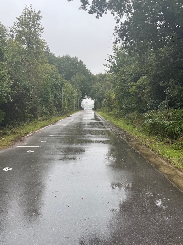 Het regent weer en ze rommelen met de fietspaden richting huis. Nog net doorheen kunnen rijden! Langs de plassen en weet je, het is me wel goed ook. Ik fiets lekker buiten, wordt nat en het is mijn weertje wel zo.