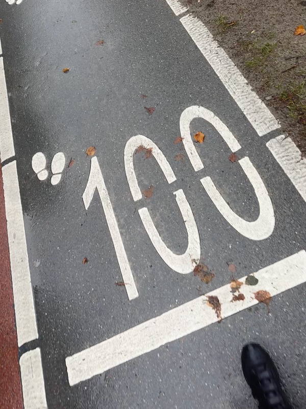 Ik heb even last van mijn enkel en li-knie. ondertussen gewoon 5:35jes blijven lopen. Ik ken het hier en dat is ook heel fijn. De wind maakt me niet uit. Alles is prima verder. Met mijn rugtasje. De laatste 200m vd 1800 tegen de wind in zijn iets zwaarder. Eindelijk iets wat niet vanzelf gaat! Dan 400 rust richting viaduct. Nog een fietser en ik moet weer nodig! Zware diarree achter een boompje. Had ik de afgelopen dagen maar niet zo moeten vreten. En de tijd staat dan stil. Het viaduct op. En af. En nog een km uitlopen. De herfst is coming.