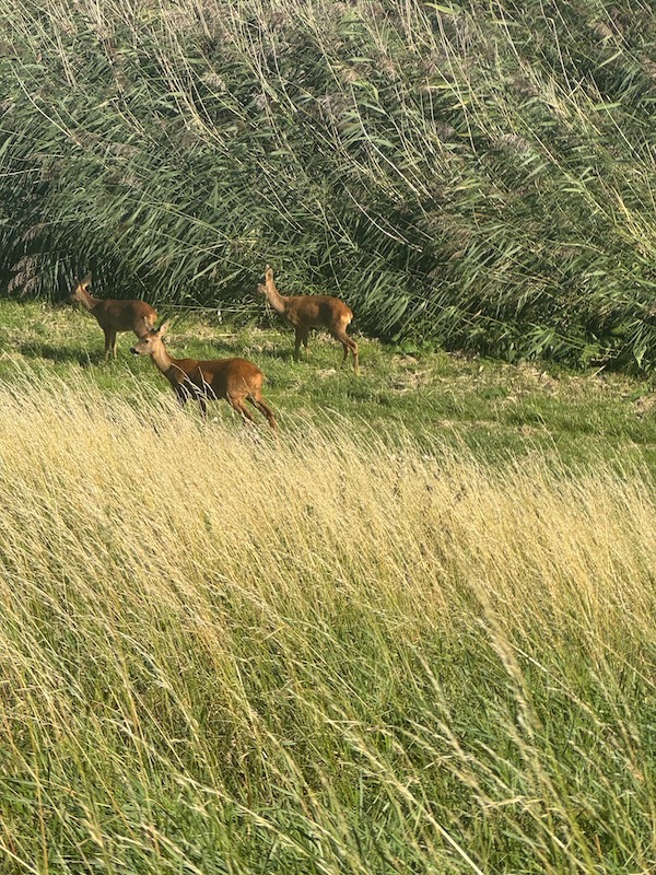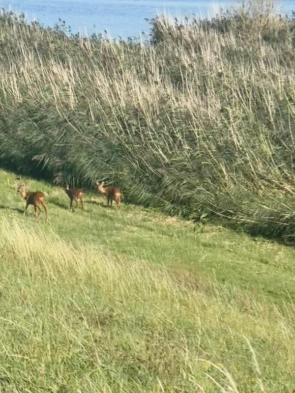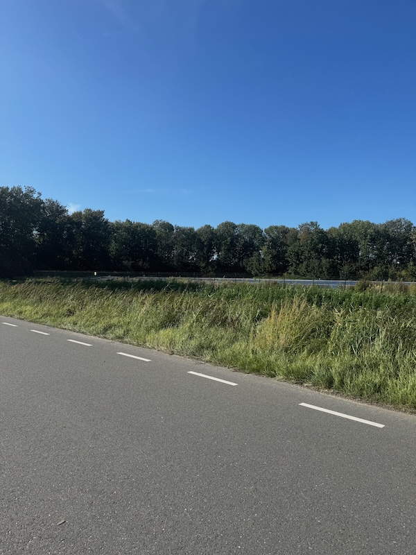 Zie je de herfst wel op komen. Dan is het fietspad dicht en moet ik om. Ietsje te hard. Weer een foto in de pauze van zonnepanelen en blauwe lucht. Dan naar de dijk, weer kalm. Ik zie Vincent in een cabrio! Zwaaien!! De dijk op is wat lastiger. Berg he 😀 Op de dijk zie ik hertjes. Schattig!