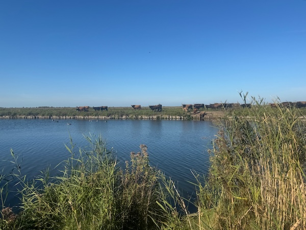 We rijden langs de plassen en daar is het donkerblauw en gouden licht echt heel, heel mooi!