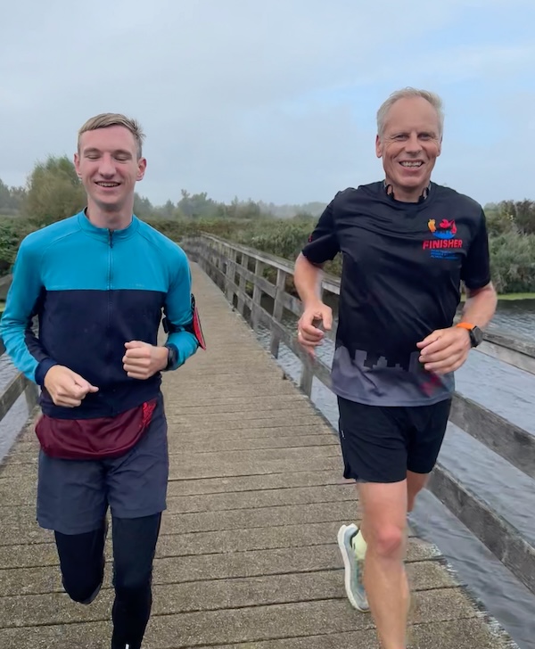 Na km 9 deed Vincent zijn jasje open en stroopte hij zijn mouwen op. “Kijken of het gaat miezeren” zei hij. Dat was de eerste 3x namelijk wel zo. Nu bleef het droog! “Ik heb t level unlocked!” riep Vincent. En zo kwamen we er achter dat hardlopen gewoon een game is. Met leveltjes en een onzichtbaar energiebalkje.