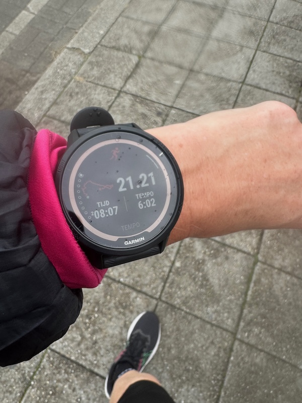 3 minuten rond 5:30 is iets lastiger tegen de wind in. Maar ik ben net op tijd klaar om rustig het viaduct op te gaan! En dan omlaag is 5:30 ook goed te doen. Ik ga tussen de huizen door en heb geen idee van afstand of tijd. 2 minuten rond 5:10 is even werken. Wind tegen, regen, warm. Maar 2 minuten werken is te overzien. Ik zwerf om de school te ontwijken en doe de laatste 2 minuten hard richting het centrum in een extra blokje om. Dan rust en ik moet eigenlijk naar de wc. Dat is jammer dan weer. Ik loop 3 van de 5 minuten uit en regen nog een keer nat voor ik alles op de WC uit kan doen. De uitvoeringsscore valt wat tegen, maar ik denk dat ik vaak iets harder liep. Alleen de pijn in de hiel blijft hangen. Tempo is eigenlijk helemaal prima zo. En zonder te stoppen ook.
