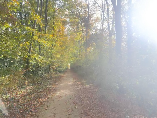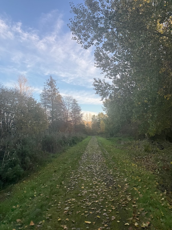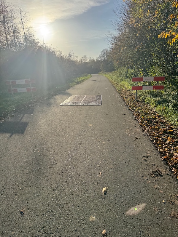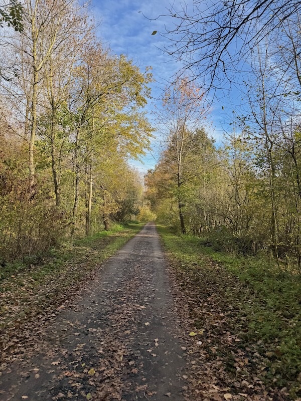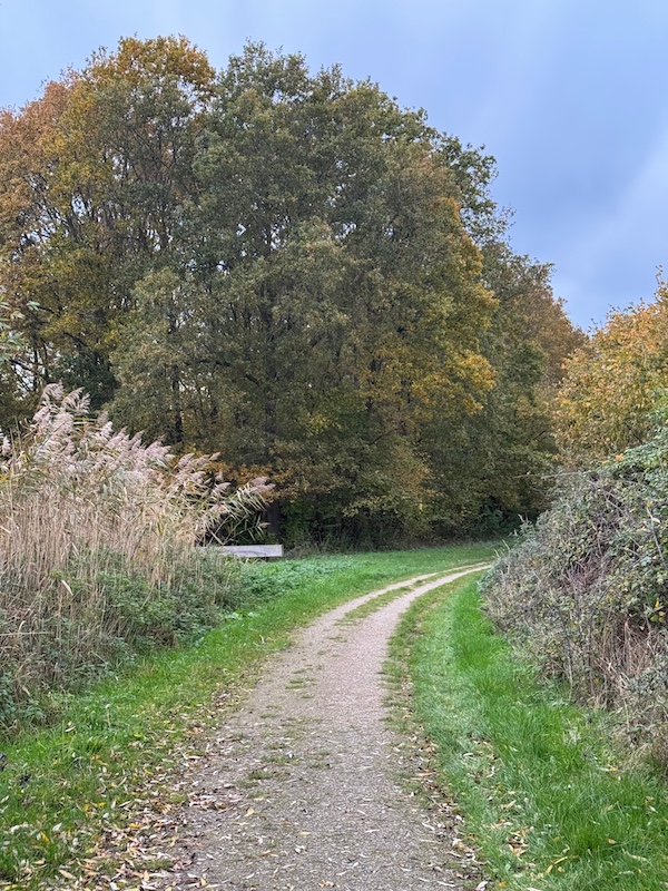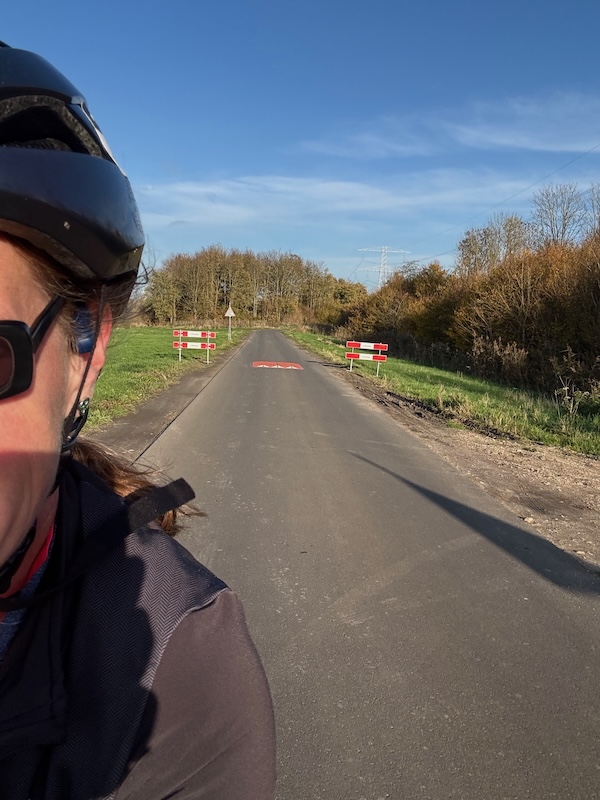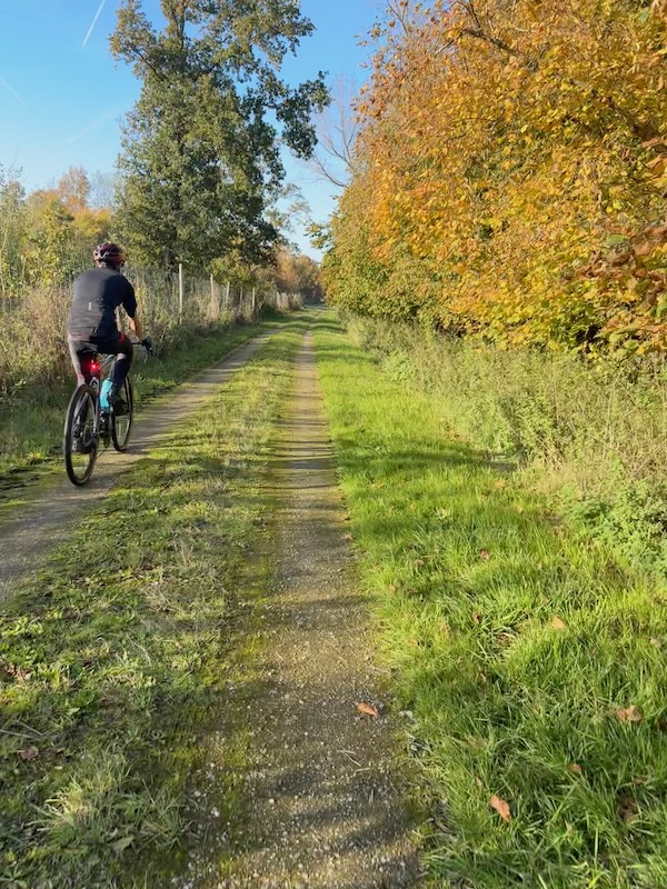 Nou, open! Maar goed geschikt voor een gravelbike! En het pad daarna is leeg en vreselijk mooi ook. Nu het er nog is, erger ik me veel minder aan de gaten en blaadjes. Ik geniet gewoon van de zon, de herfst en het moment.