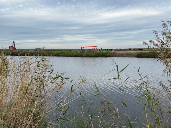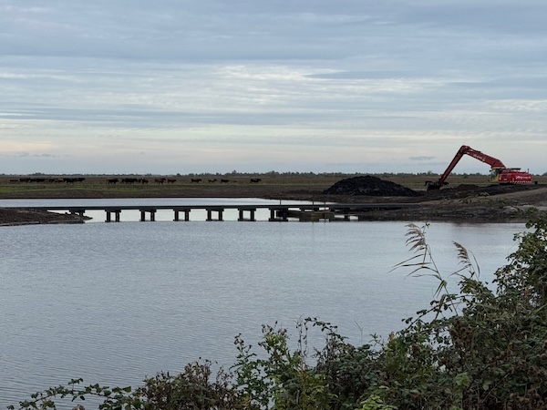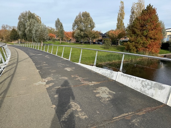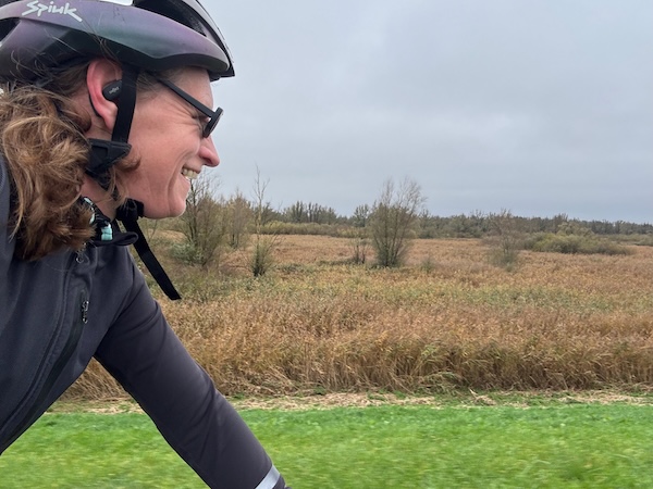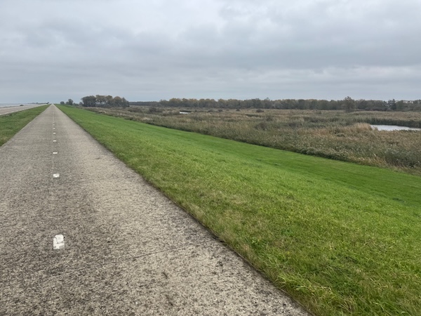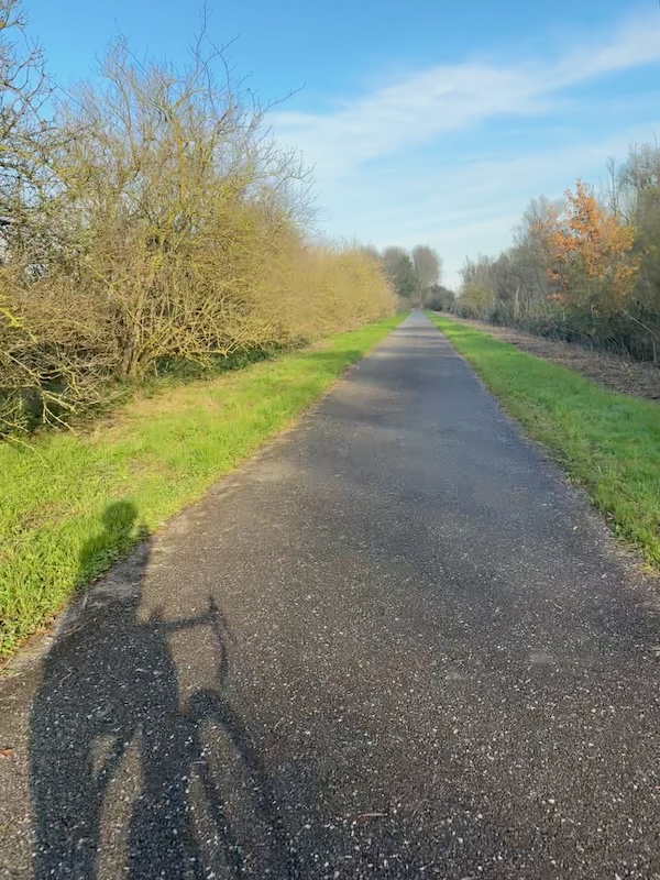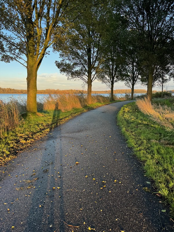 Hij is gister een beetje verliefd geworden op mijn gravelbike. Hij vindt het een heerlijk scheurbakkie. Dus ik moet maar mee op de gravelbike met motortje. Ik zet de motor slechts op 4/5 want die is pas half vol en loopt snel leeg bij dit koelere weer. En dan nog is het doorwerken voor mij! We gaan door het bos en ook dat is kei-mooi. Maar ik vind de snelheid wat hoog en moet goed opletten! Ook leuk. Aan het einde heb ik er hoofdpijn van. We pakken het hele verbindingspad, wat Vincent nog nooit gedaan schijnt te hebben! Dan de dijk. Even doorscheuren. Ik bedenk het Da Vincipad. Ook leuk en smal en mooi en rustig.