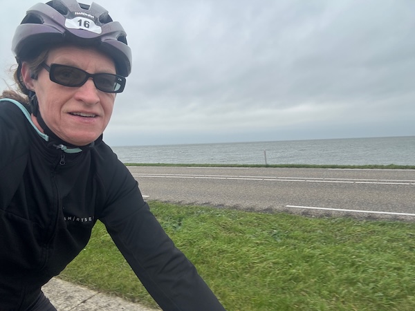 Vannacht slecht geslapen: lag te woelen, katten op mijn benen, 2 keer plassen, trekkerige spieren, onrustig, beetje trek en weer vroeg wakker. Bij het opstaan heb ik flinke spierpijn! Gelukkig, dan heb ik ook eens het gevoel dat ik iets heb gedaan. Ik kan prima de trap op en af en ook gewoon lopen. Ik heb hoofdpijn en honger. Na een ontbijt en na veel thee is dat weer weg. Verslag schrijven en alles op een rijtje zetten. Ik ben wel eens vermoeider geweest! De spierpijn trekt eigenlijk snel weg. Wat blijft zijn de schuurplekken onder mijn arm. Gelukkig heb ik een dag vrij! Deze week heb ik een herstelweek en mag ik zelf doen wat ik wel: beetje rustig bewegen. Ik wilde toch al fietsen vandaag en het is droog en bewolkt en kil buiten, dus na de lunch ga ik gewoon.