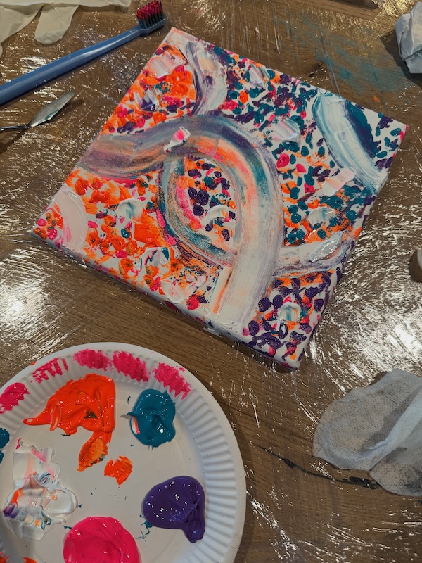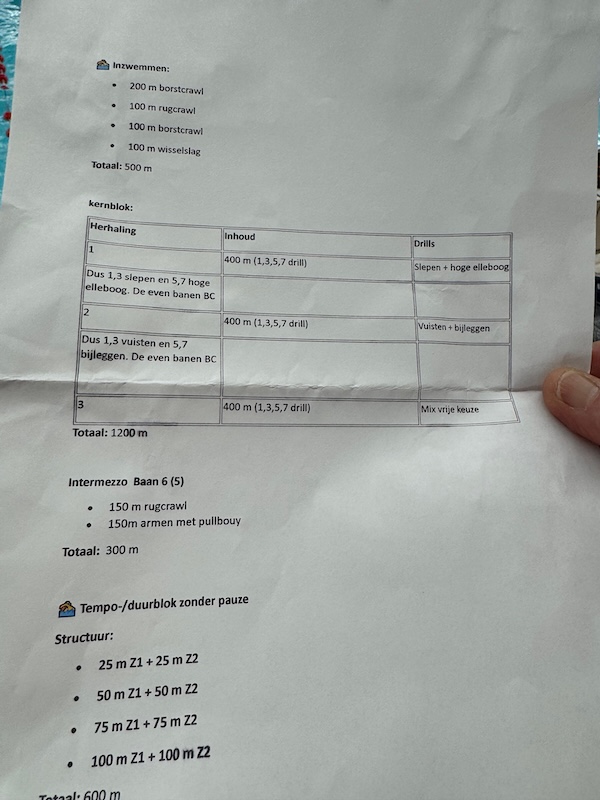 Daarna workshopjes, sociaal doen, schilderen, denken en dan naar huis voor telefoon. Erg veel gesnoept, want van alle onrust zin in suiker. Ik had hoofdpijn. Eten. Dan ff zitten. Geen kindjes voor snoep aub. En door naar Manuels huis en dan nog zwemmen. Nee, totaal geen zin. Nul komma 0️⃣. Weg van al het geklets. Zwemmen. Een kilometer, een half uurtje of 48 minuten. In baan 3. Het ging!! Hoe dan?!?! Kalm. Moeiteloos eigenlijk. Zou niet zo moeten zijn nu qua hormonen… dat geeft te denken. Inzwemmen gaat lekker. R geeft training. Ik zwem achter W. We doen stukken met tempo en dat gaat opvallend moeiteloos! Ik kan zelf mijn tempo bepalen!!!! Dat is me wat zeg! Was het tot nog toe: de overkant gehaald en als het harder moet mij niet bellen, maar nu was het iets mijn best doen en versnellen. En de rest inhouden. Ik deed ‘eigen keus’ zo der achtje en ik moet zeggen: dat kan dus ook!