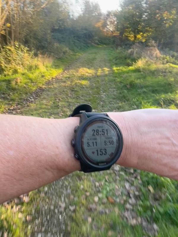 Omdat het tempo me niet zoveel boeit, ga ik ook terug door het bos. Dat is fijner voor als het opeens moet. Ik loop de 5km in ruim 28 minuten! Onverhard! Lekker! Zonder pauze!