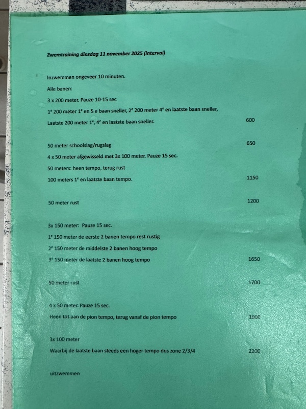 Ik mag niet in baan 1/2, maar moet naar 3/4. Totaal niet vandaag. Ik doe maar wat en probeer te blijven ademhalen en drijven. Zelfs als ik de gemiste 75m erbij op tel. Het was ook veel gedoe, met rug er tussen en met ‘drills’. Ik had alleen een zone 1 geloof ik. En steeds minder energie en zin. Ik maakte mijn eigen tot doel gestelde 50 minuten vol en dan snel er uit! Voor een anti-sociale dag was ik aardig tegen AA, maar zij is ook wel oke. Morgen gaat Rob weer weg. Eindeloos. Ach, deze periode, zo voor de 12de uit is nooit ‘mijn’ moment en nu ff helemaal niet. 📉👎🏼