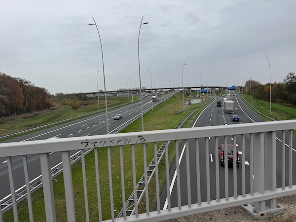 De eerste 2,5km over industrieterrein. Op de weg, tussen vrachtwagens en met miezer. En een beetje haast dus (wilde ik nog douchen na het lopen). Maar ook goeie benen en wat ergernis. Kreeg wel bewondering van de vrijdagwerkers. En stoppen. Om over te steken. Dan langs ASML waar de medewerkers tussen het beton hun sneue lunchrondje wandelen. Langs de snelweg. Ik vond het allemaal niks, maar ik ging loeisnel!