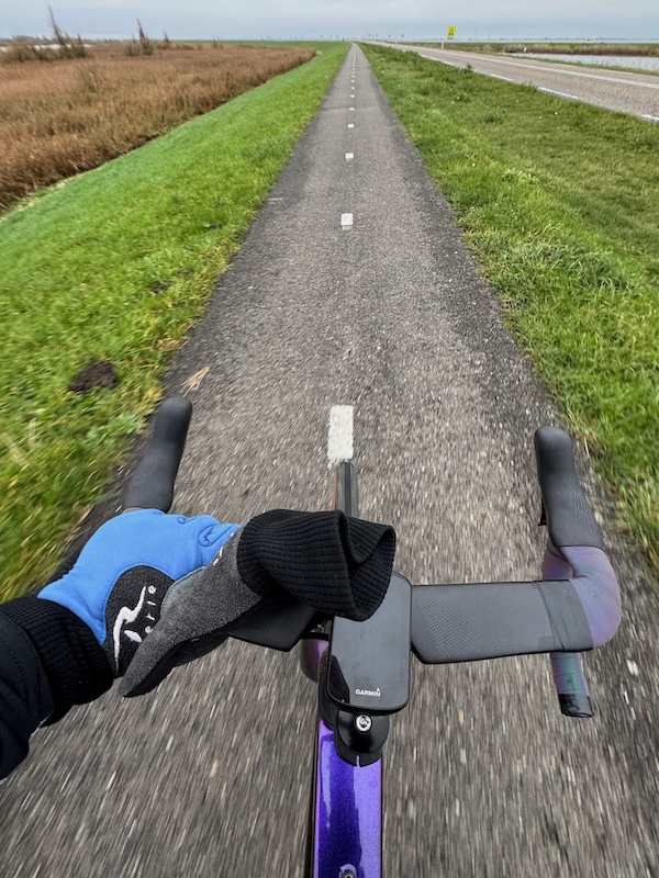 Mijn benen denken echt: NOWAY, hoe kom je er op?!?! Maar ze doen wel hun werk en na verloop van tijd vinden ze het prima en naderhand is de spierpijn ook wel weg. Maar enig tempo is ook weg. Had ik wel verwacht en het is ook niet heel erg, ik ben nou eenmaal niet zo’n wondermens wat volgende week weer een marathon zou kunnen/willen lopen. Goed opletten in de stad, want ik merk wel dat het hoofd ook moe is. Ik had in elk geval nog wel naar de wind gekeken en wind mee op de dijk. Niet dat het veel gemakkelijker fietst (arme beentjes), maar ik ga tenminste ietsje sneller.